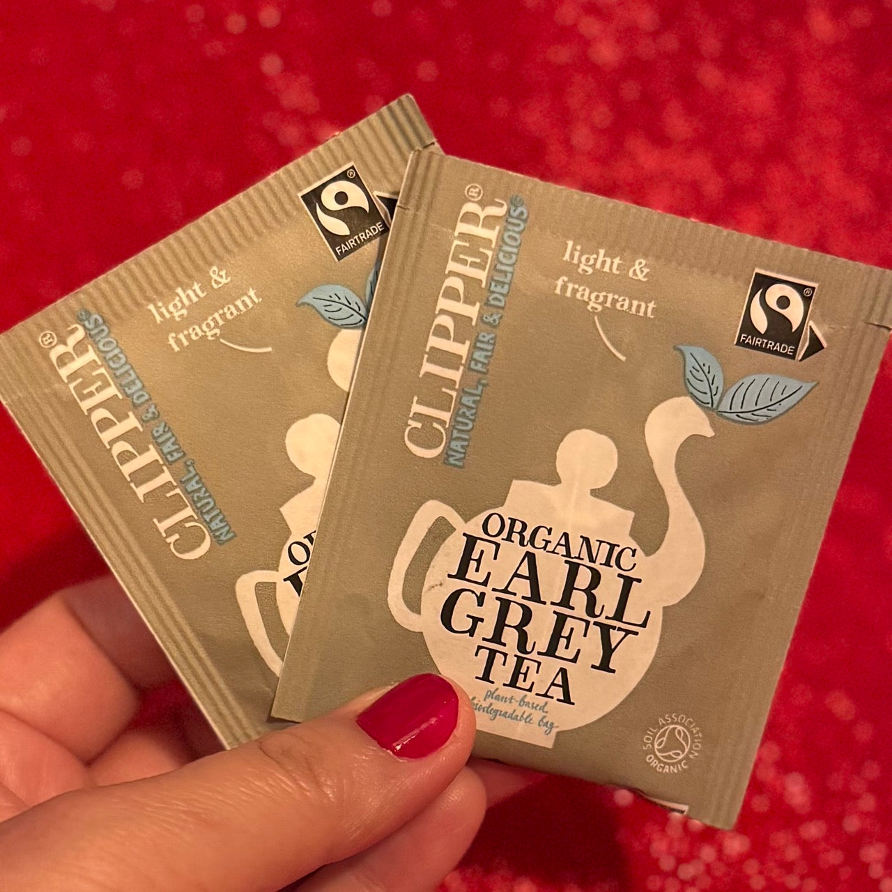 - Two Clipper's Fair Trade Earl Grey tea bags.