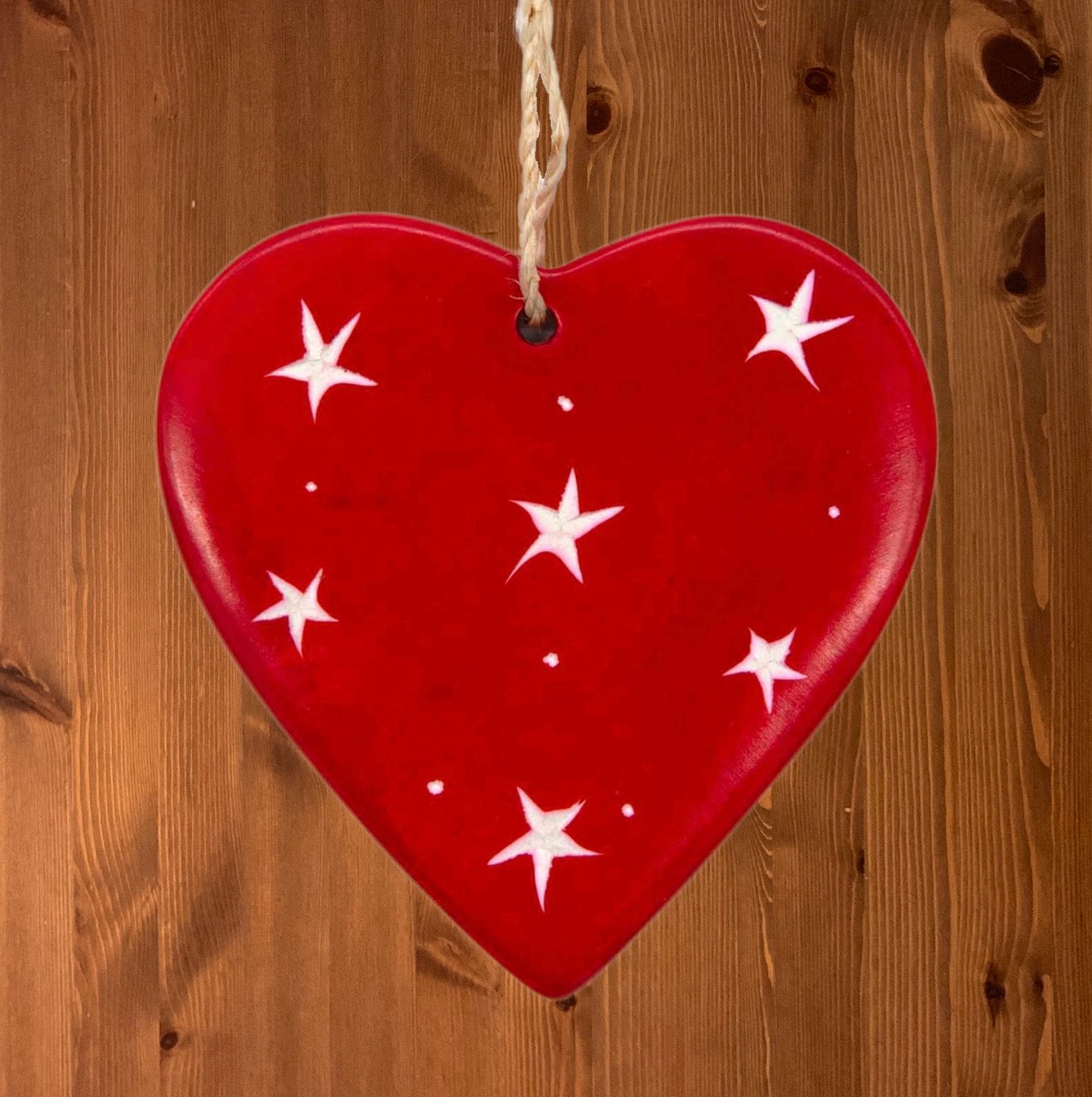 - A heart decoration, hand-carved from Kenyan soapstone (fragile), presented in a red velvet pouch. Each decoration is unique and carries its own markings.